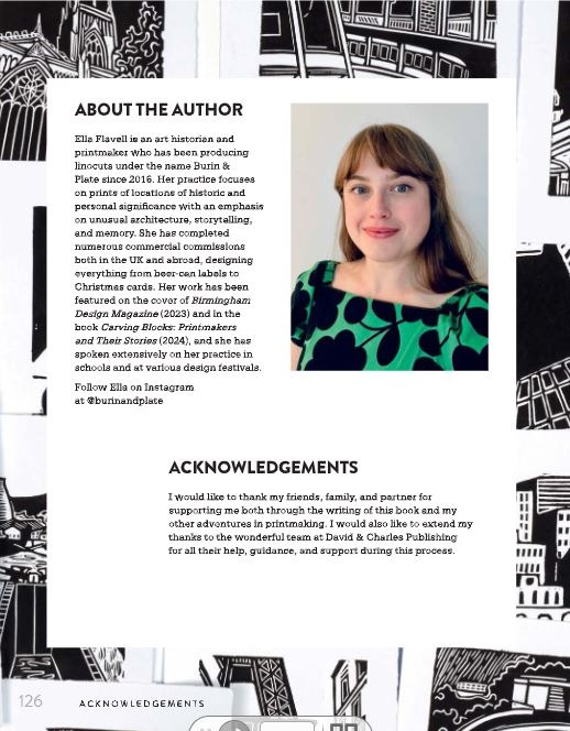 Ella Flavell is an art historian and printmaker who has been producing linocuts under the name Burin & Plate since 2016. Her practice focuses on prints of locations of historic and personal significance with an emphasis on pattern and graphic contrast. She had completed numerous commercial commissions both in the UK and abroad designing everything from beer can labels to Christmas cards. Her work has been featured on the cover of Birmingham Design Magazine (2023) and inCarving Blocks: Printmakers and Their Stories(2024), and she has spoken extensively on her practice in schools and at design festivals.