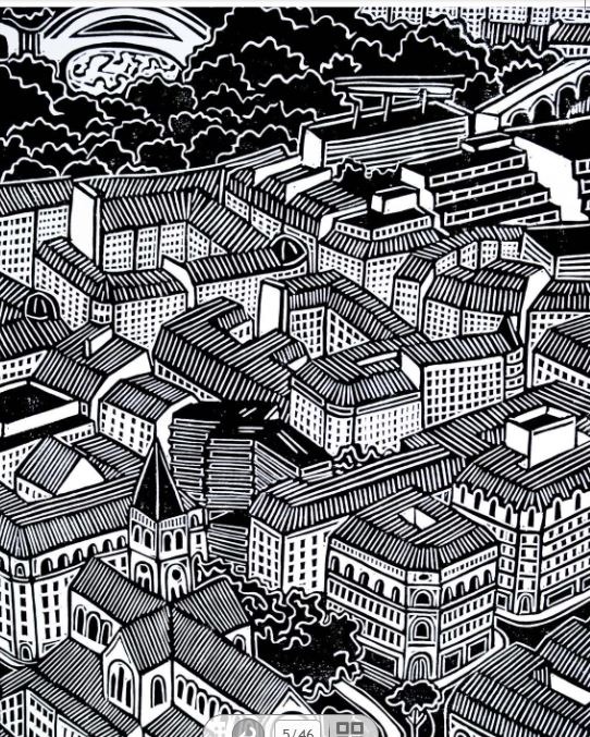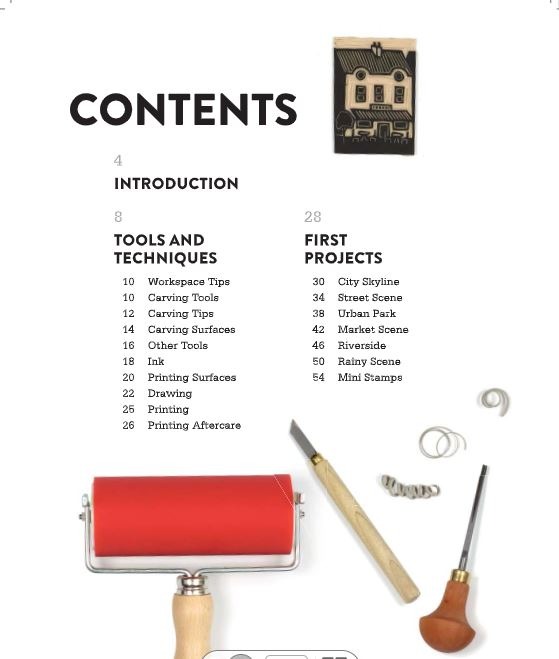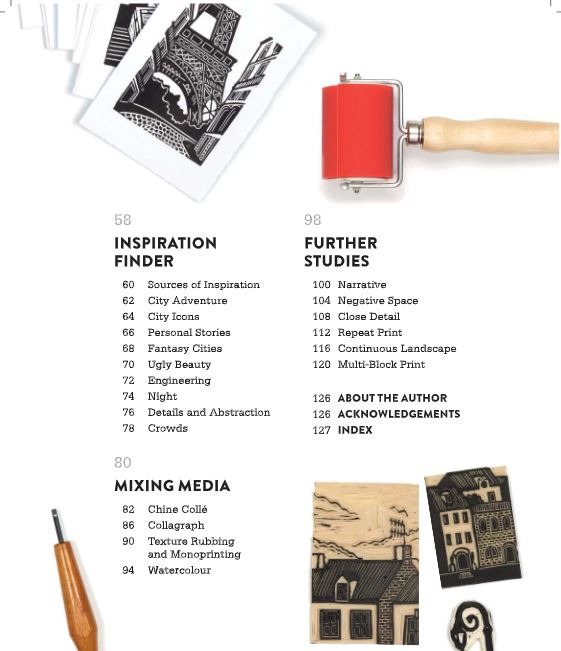 Het Engelstalige boek bevat een inleidend gedeelte waarin de basistechnieken van linosnede worden getoond . daarnaast is het een gids om inspiratie voor je werk te vinden in het straatbeeld: .gedetailleerde architecturale skylines, bruggen, putdeksels, straatmeubilair en diverse menigtes bieden een nieuw perspectief op deze traditionele kunstvorm.