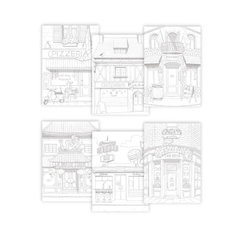 In dit sfeervolle kleurboek neem je de tijd om zes charmante winkelgevels tot leven te brengen. Emmanuelle Colin heeft zich laten inspireren door gezellige straatjes en herkenbare façades, zoals een pizzeria, crêperie en andere uitnodigende storefronts. De illustraties zitten vol fijne details en rustige lijnen, waardoor ze prettig kleuren en veel ruimte laten voor je eigen kleurkeuzes.