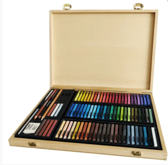 Prachtige houten kist met alle kleuren Conte Carre harde pastels. Daarnaast zitten er 3 pastelpotloden, en gum en 2 doezelaars in deze kist.