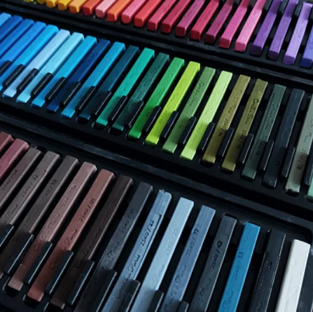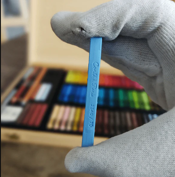 Beautiful wooden box with all colours Conte Carre hard pastels. In addition, there are 3 pastel pencils, an eraser and 2 feathers in this box.