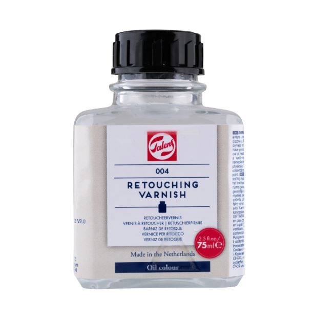 Talens retoucheervernis wordt gebruikt voor het ophalen van ingeschoten (matte) plekken en tijdelijke bescherming (voorlopig slotvernis) van een niet volledig droog olieverfschilderij.