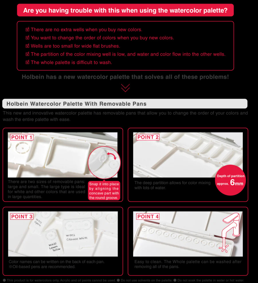 This product is only for water colours. Acrylic and oil colours cannot be used. Do not use solvents on the palette.