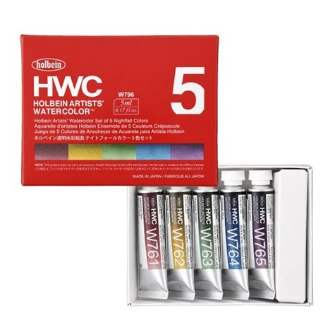 Set of 5 x 5 ml watercolour tubes from Holbein Artists Nightfall Colours. These dark, subtle colours reveal nuances when diluted, making them ideal for shadows, accents and grainy effects. High durability and no additives.
