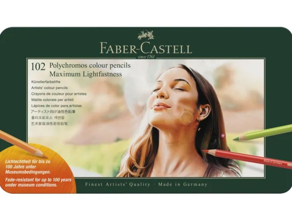 Polychromos coloured pencils are internationally recognised by professional and semi-professional users for their unrivalled quality. Whether for graphic applications, artistic freehand designs or the precise colouring of drawings, Polychromos coloured pencils impress with their high quality standard. They have a round shape with high-quality pigments offering unrivalled lightfastness and colour brilliance with a soft, colourful layer. With high break resistance thanks to the secural bonding (SV) process. They are smudge-proof and waterproof and have a 3.8 mm colour core. The wood of the pencils comes from certified, sustainable forestry and is coated with an environmentally friendly water-based lacquer. Tin with 102 colours with maximum lightfastness of 3 stars.