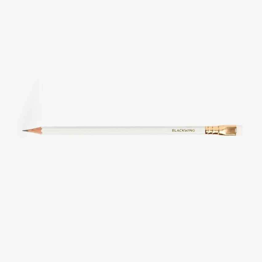 Het potlood heeft een parelwitte afwerking, iconische vierkante Blackwing-ferrule en vervangbare witte gum.