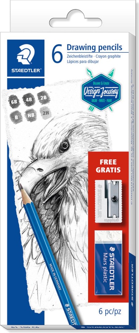• Cardboard case with 6 assorted Lumograph pencils (2H, HB, B, 2B, 4B, 6B), small Mars plastic eraser 526 53 and metal sharpener 510 10.