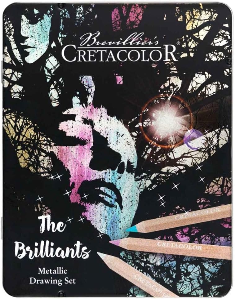 Cretacolor Metal & Black "The Brilliants" 12 metalliic kleurpotloden met tekenboek is een geweldige set met 12 extra dikke metallic kleurpotloden in een blik, een puntenslijper voor deze potloden en een luxe tekenboek A5 met 110 grams zwart papier. Je kunt dus direct aan de slag!