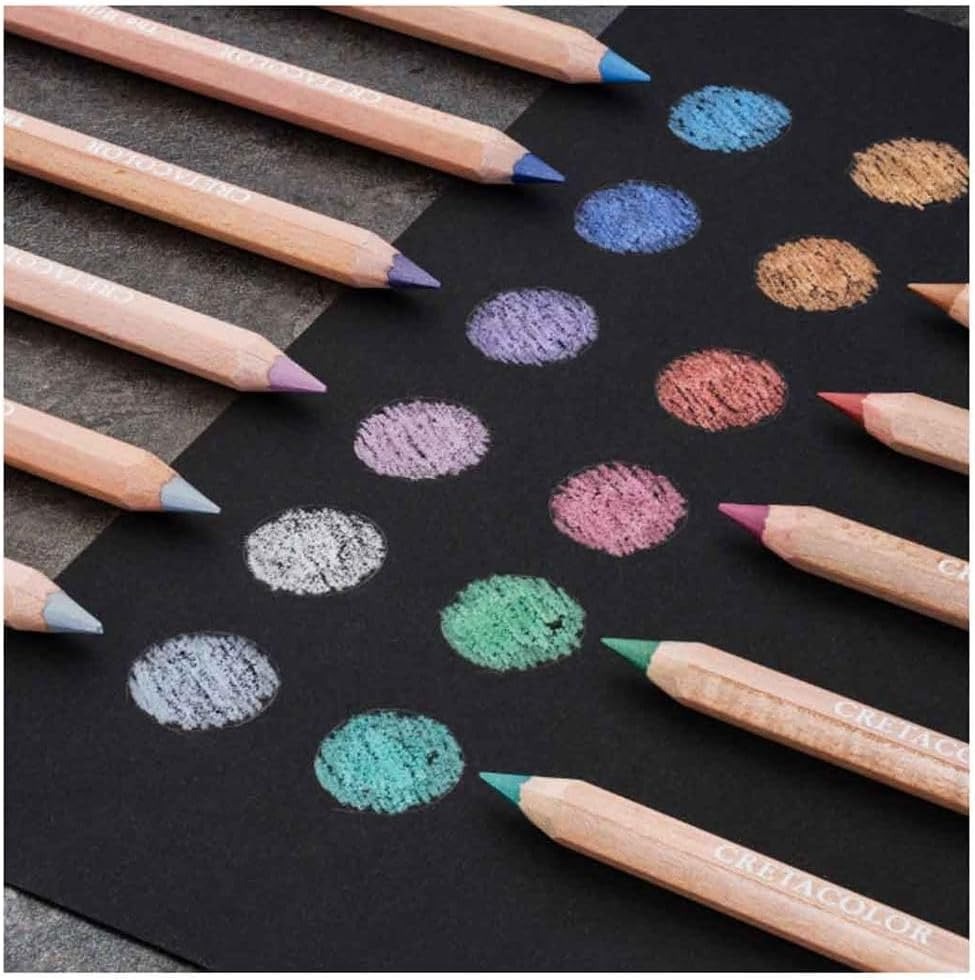 De extra dikke potloden hebben sterke pigmenten voor een goede kleurkracht. De metallic komen op zwart papier extra goed tot zijn recht.