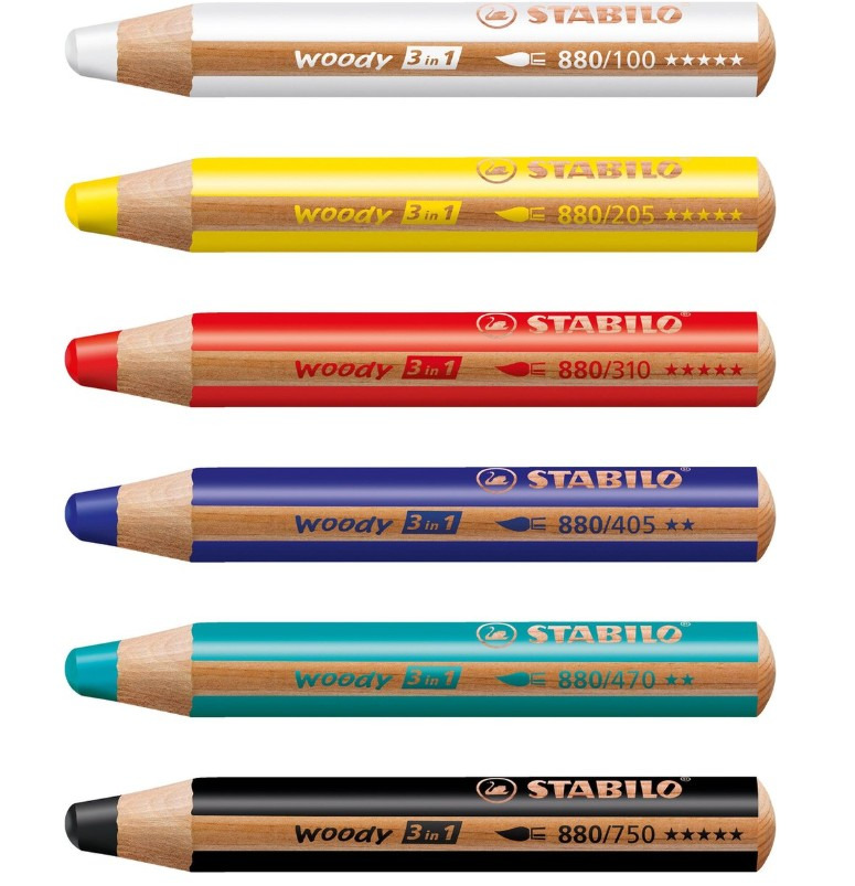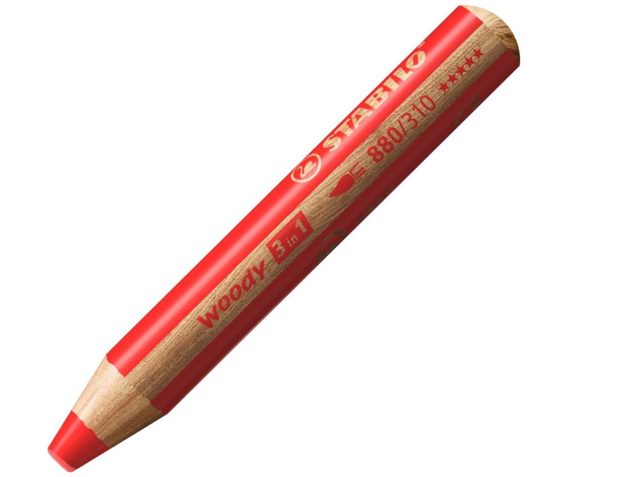De Woody 3-in-1 is een kleurpotlood, waskrijt en aquarelpotlood in één. Er kan zowel op papier en karton worden gekleurd (zelfs op zwart papier!) als op gladde oppervlakken, zoals ramen, kunststof, regenlaarzen, broodtrommels, noem maar op. Met een kwast en water erbij kunnen prachtige kunstwerken worden gemaakt.