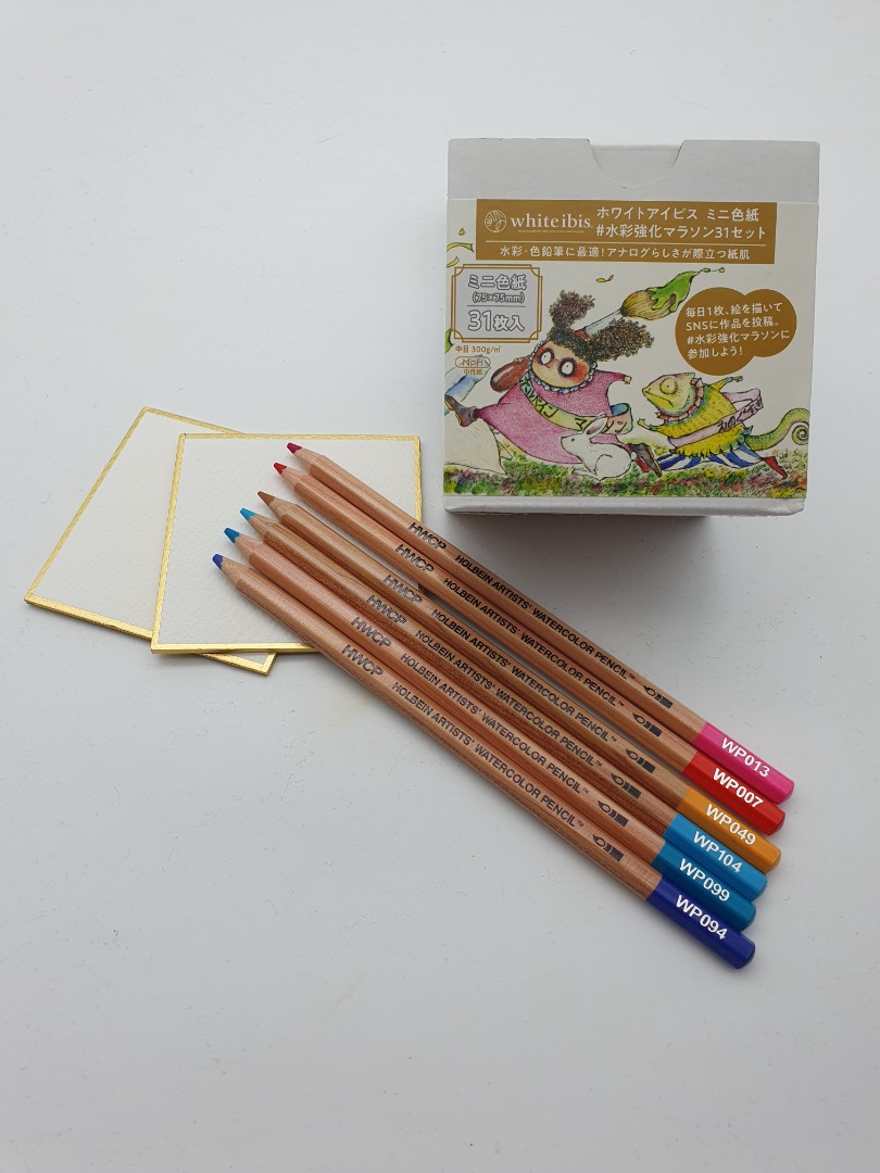 Je krijgt een Holbein aquarelpotlood en een White Ibis aquarelkarton CP in de maat 7,5 x 7,5 cm met prachtige gouden randjes.