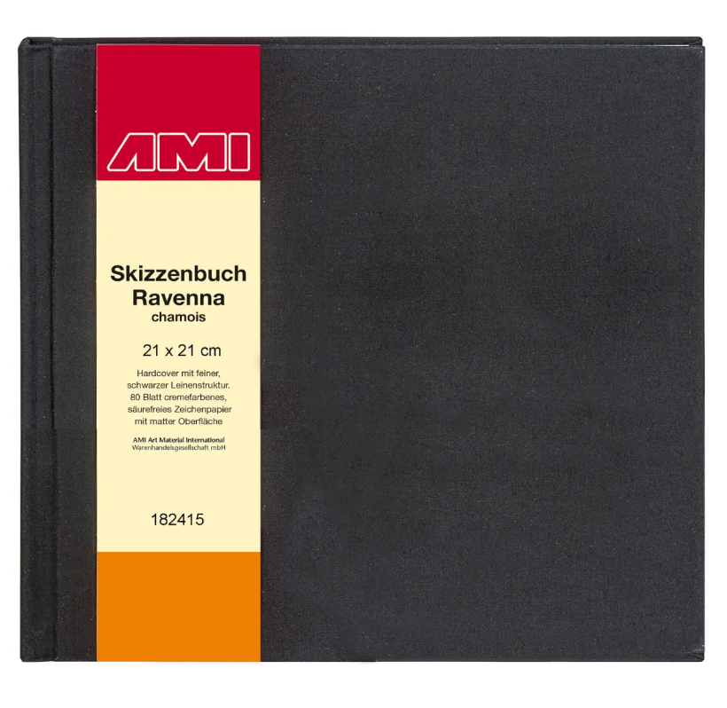 A square sketchbook with a black hard cover. The drawing paper has a matte surface, a cream colour and is acid-free.