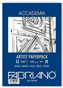 Fabriano’s Accademia tekenpapier is een veelgebruikt tekenpapier. Dat is niet gek gezien de uitstekende prijs/kwaliteitverhouding. Het is gemaakt van 100% cellulose. Artiesten roemen het papier omdat er goed op te gummen valt zonder dat het papier beschadigt en omdat het een prettige en subtiele korrel heeft.