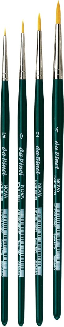 Set van vier ronde penselen uit serie 1570 (3/0-0-2-4) van de fijnste, goudkleurige synthetische vezels.