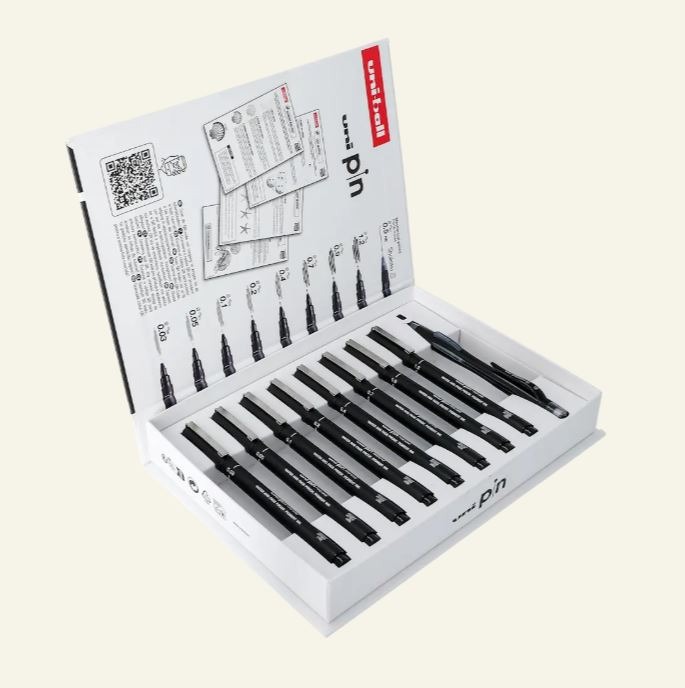 The set includes no less than eight fineliner pens in different widths and a pencil. The set also includes tips and tricks for creating beautiful dotwork drawings. The text is in English. The classic Uni Pin pens have waterproof, lightfast ink and are perfect for sketches, manga, drawings or simply for writing. The set contains one pen each in the following line widths: 0.03 mm, 0.05 mm, 0.1 mm, 0.2 mm, 0.4 mm, 0.7 mm, 0.9 mm, 1.2 mm and a 0.5 mm mechanical pencil.
