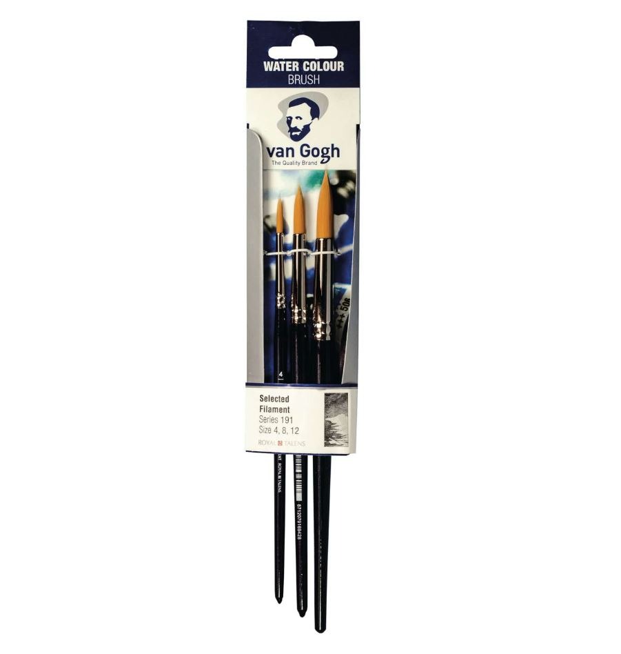 The carefully crafted and hand-shaped Van Gogh 191 watercolour brushes from Royal Talens in this set of three have a round, flexible tip made of synthetic hair.