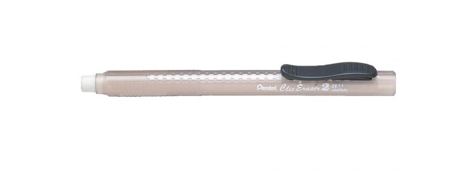 The Pentel Clic Eraser ZE11T-A is a pen-shaped eraser housed in a transparent barrel. The clip allows you to slide the eraser core. Ideal for erasing hi-polymer and standard pencil lines.