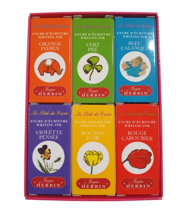 The J. Herbin Vitamin Ink Set contains 6 vibrant ink colours in handy 10 ml bottles. This water-based fountain pen ink is known for its smooth flow and bright pigmentation. Ideal for fountain pens, journaling, calligraphy and creative projects. Perfect as a gift or to try out different colours.