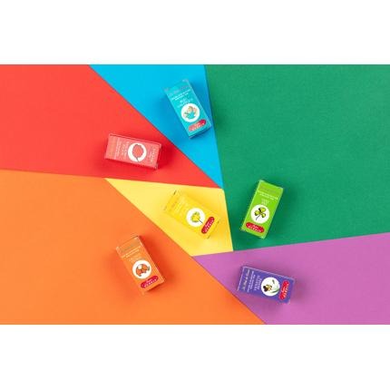 The set consists of 6 glass bottles of 10 ml in the colours: