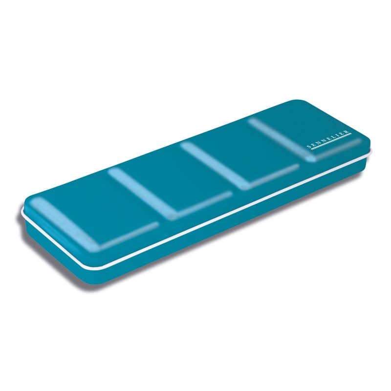 Metalen doos met 12 halve pans en ruimte voor nog eens 12 halve pans, zodat de set kan worden aangepast.