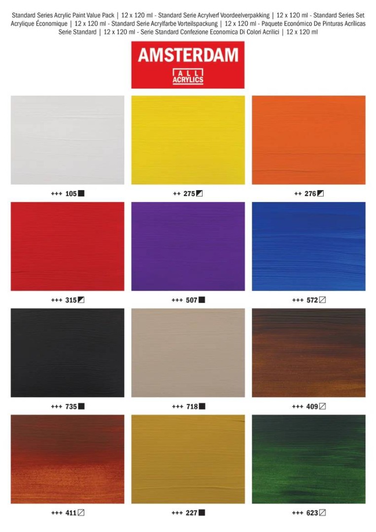 The Talens Amsterdam Acrylic Paint Value Pack contains 12 x 120 ml tubes of acrylic paint and offers you an extensive range of brilliant, pure colours. Talens Amsterdam is the best-selling acrylic paint in the Netherlands and is also very popular worldwide.
