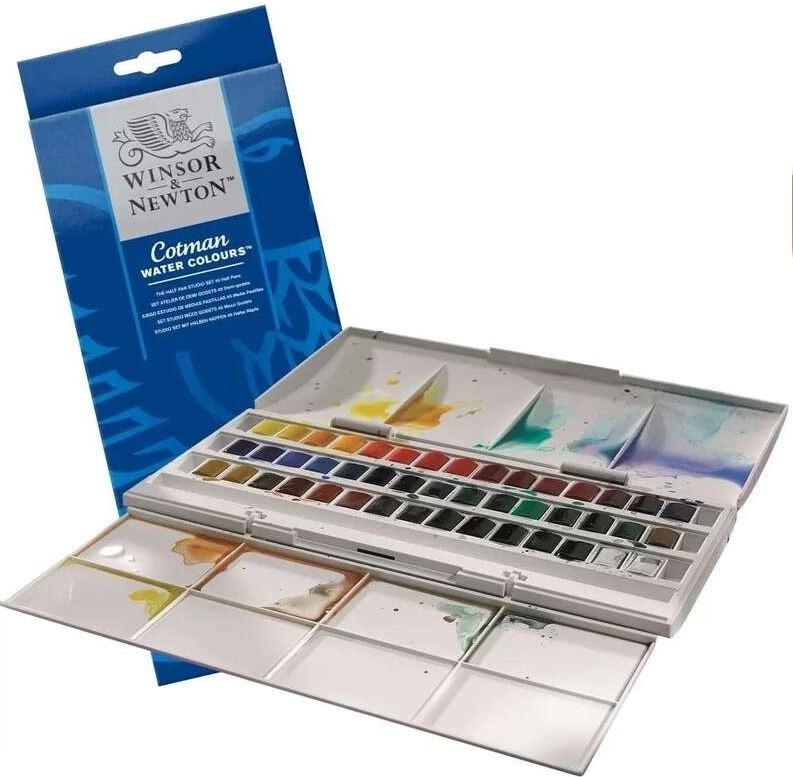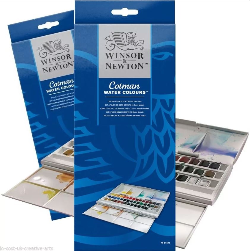 GIFT TIP Winsor Newton Cotman watercolour paint 45 pans with brush in plastic travel box