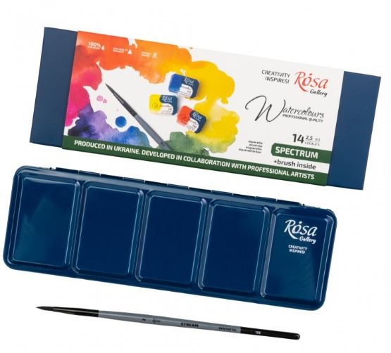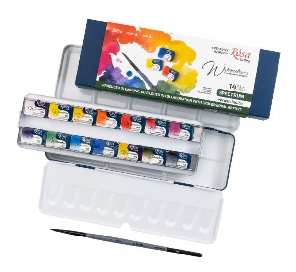 Watercolor Cases ROSA Gallery are metal boxes with two palettes of different configurations. They have a special insert for the cuvette and a convenient finger holder on the bottom of the case, which makes it easy to hold the paint in a hand while working.