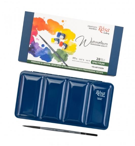 Watercolor Cases ROSA Gallery are metal boxes with two palettes of different configurations. They have a special insert for the cuvette and a convenient finger holder on the bottom of the case, which makes it easy to hold the paint in a hand while working.