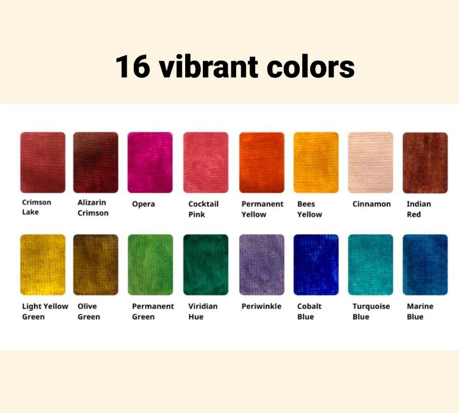 De transparante, levendige en extreem intense kleuren zijn super-verzadigd. Op de bijgevoegde swatch card kun je zien hoe ze er opgedroogd op papier uitzien. Elk boxje wordt afgesloten door een plastic-coated klepje, dat je als mengpaletje kunt gebruiken. En het schoonmaken van dat mengpaletje kan niet eenvoudiger — just wipe clean & reuse!