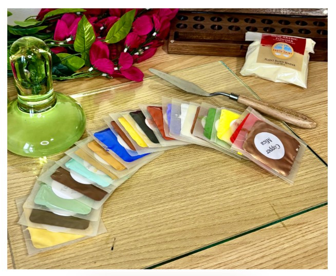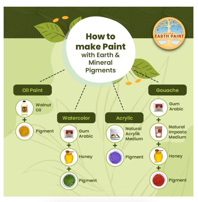 Met deze natuurlijke, niet-giftige pigmenten maak je prachtige stralende en lichtechte verf. de pigmenten zijn de basis voor verschillende soorten verf, afhankelijk van de binder die je gebruikt. Recepten hiervoor vind je op de site www.naturalearthpaint.com
