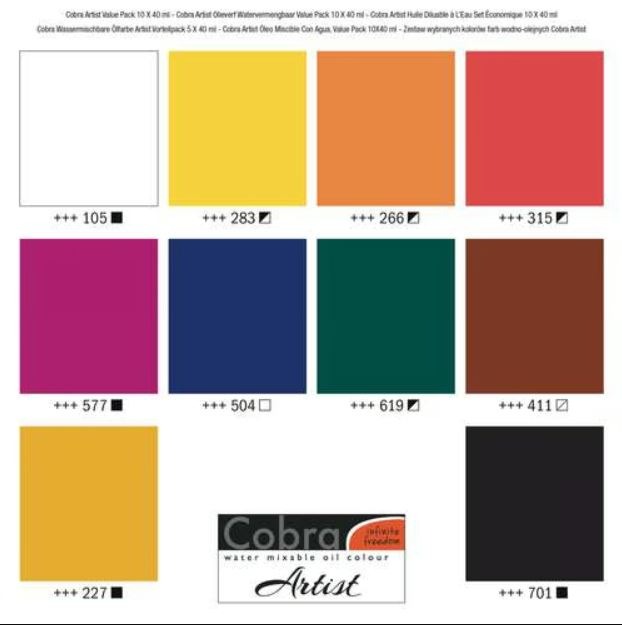 Deze Cobra set bevat:10 tubes van 40 ml in de kleuren: 105 Titaanwit, 283 Permanent geel licht, 266 Permanent oranje, 315 Pyrrole rood, 577 Permanent roodviolet 40, 504 Ultramarijn, 619 Permanent groen licht, 411 Sienna gebrand, 227 Gele oker, 701 ivoorzwart