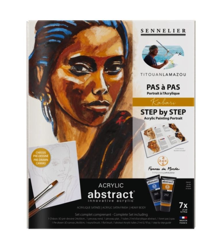 Would you like to learn how to paint portraits? The acrylic painting set contains all the materials and step-by-step instructions you need to get started right away: 7 acrylic paints (21 ml each), a canvas with a painting template (24 x 30 cm) and a round and flat brush.